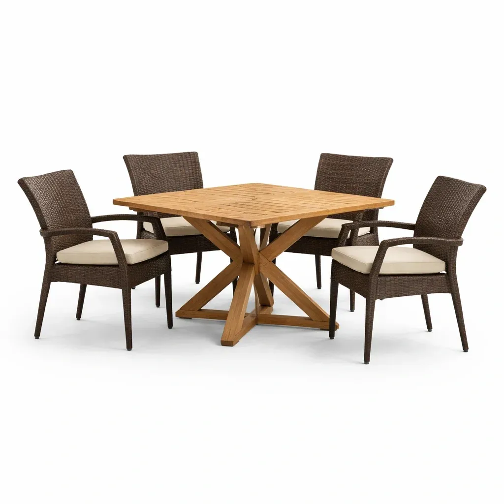 Materiale: Tavolo in legno teak, sedie in rattan sintetico con cuscini in tessuto poliestere