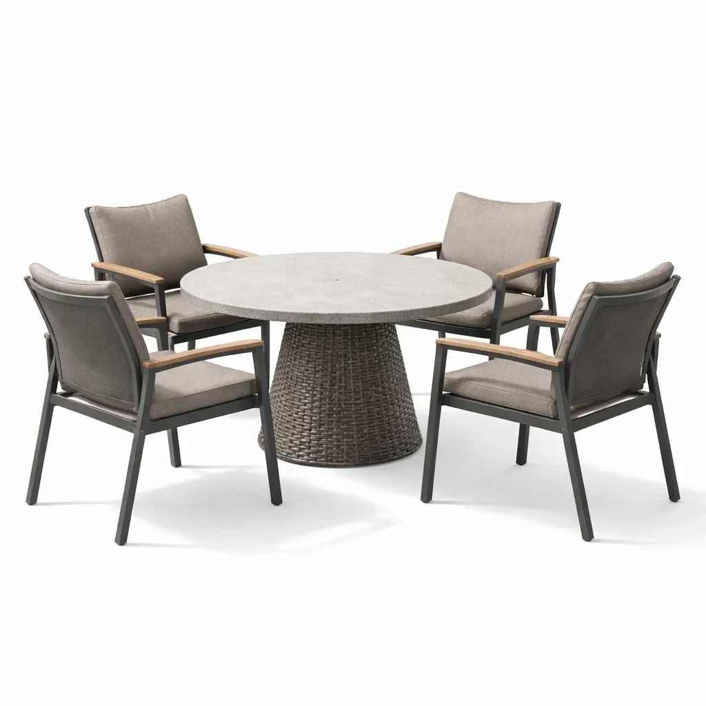 Materiali: Tavolo in alluminio con piano in cemento composito; sedie in alluminio con seduta e schienale in tessuto di poliestere e braccioli in legno.